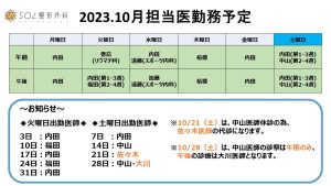 2023.10月の医師勤務表を更新しました。
