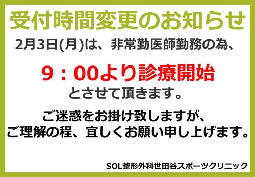 2025.2月3日(月)診療開始時刻変更のお知らせ