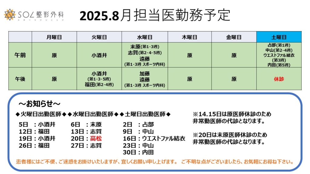 2025.8月の医師勤務表を更新しました。