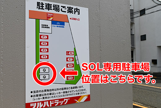ツルハドラック横にSOL専用駐車場2台完備しております。