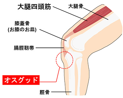 脛骨粗面(膝のお皿の下)の部分が突出してきて痛みと腫れが生じる疾患です。未成熟で力学的に弱い脛骨粗面への繰り返す大腿四頭筋の牽引力が原因で発症します。成長期に積極的にスポーツをしている小学生高学年から中学生(男児は10~14歳、女児は8~12歳)に発症しやすいのが特徴です。約3割は両側性に発症します。