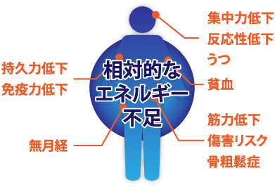 エネルギーが不足する状態を指します。つまり「成長」や「トレーニング」に見合った分、食事で十分なカロリーを摂ることが出来ていない状態です。無月経、骨粗鬆症、貧血、免疫力低下、パフォーマンス低下、傷害リスク増加、うつ傾向など様々な問題につながります。